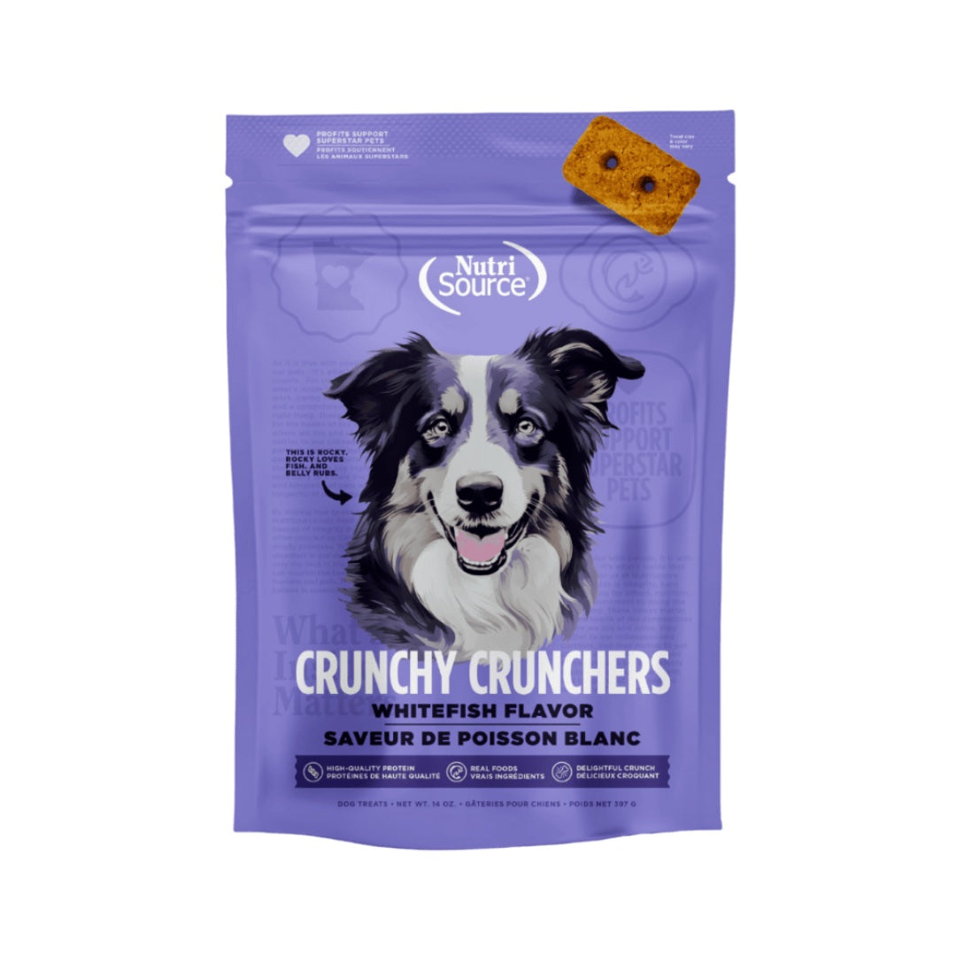 NutriSource Whitefish Crunchy Crunchers 14oz. Snacks crujientes grain free con pescado blanco como principal ingrediente, perfectos como premio para perros.